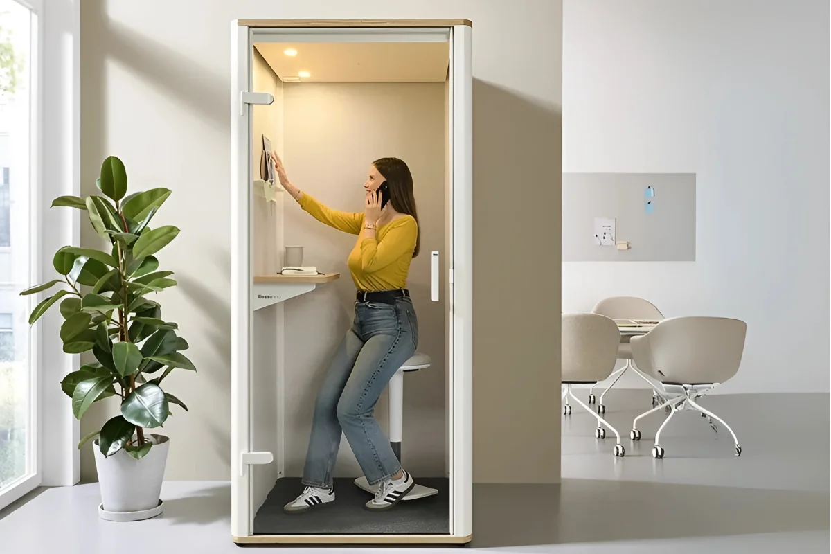 Hochwertige Materialien, cleveres Design und durchdachte Funktionalität machen die Bosselino Uno zu einem echten Highlight. Die schallabsorbierenden Akustikpaneele aus 100 % recyceltem PET garantieren, dass störende Geräusche draußen bleiben und Gespräche diskret geführt werden können. Für eine angenehme Atmosphäre sorgen energieeffiziente LED-Beleuchtung sowie zwei leise Ventilatoren, die kontinuierlich Frischluft zuführen.